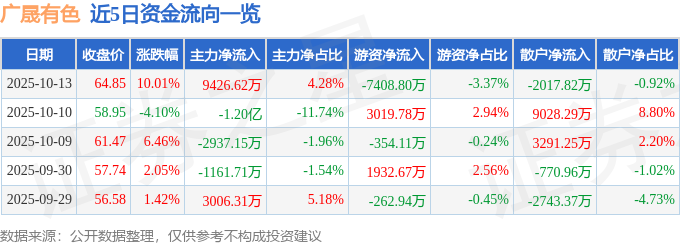 证券之星消息,截至2025年10月13日收盘,广晟有色(600259)报收于64.85元,上涨10.01%,换手率10.4%,成交量34.97万手,成交额22.0亿元。