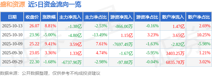 证券之星消息,截至2025年10月13日收盘,盛和资源(600392)报收于26.07元,上涨8.81%,换手率12.25%,成交量214.67万手,成交额54.64亿元。