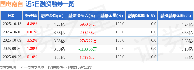 国电南自融资融券信息显示,融资方面,当日融资买入2.14亿元,融资偿还1.45亿元,融资净买入6950.64万元,连续3日净买入累计1.17亿元。融券方面,融券卖出0.0股,融券偿还0.0股,融券余量100.0股,融券余额0.12万元。融资融券余额4.27亿元。