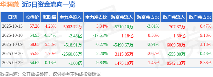 证券之星消息,截至2025年10月13日收盘,华润微(688396)报收于57.28元,上涨4.28%,换手率2.01%,成交量26.73万手,成交额15.0亿元。
