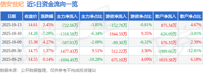 证券之星消息,截至2025年10月13日收盘,信安世纪(688201)报收于14.61元,上涨2.45%,换手率4.3%,成交量13.02万手,成交额1.87亿元。