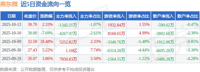证券之星消息,截至2025年10月13日收盘,燕东微(688172)报收于30.7元,上涨2.33%,换手率7.29%,成交量42.67万手,成交额12.49亿元。