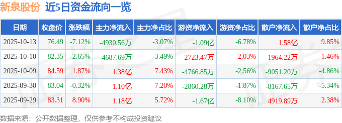 证券之星消息,截至2025年10月13日收盘,新泉股份(603179)报收于76.49元,下跌7.12%,换手率4.25%,成交量20.9万手,成交额16.06亿元。