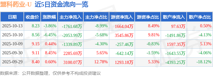 证券之星消息,截至2025年10月13日收盘,盟科药业(688373)报收于8.23元,下跌3.86%,换手率4.49%,成交量23.61万手,成交额1.96亿元。