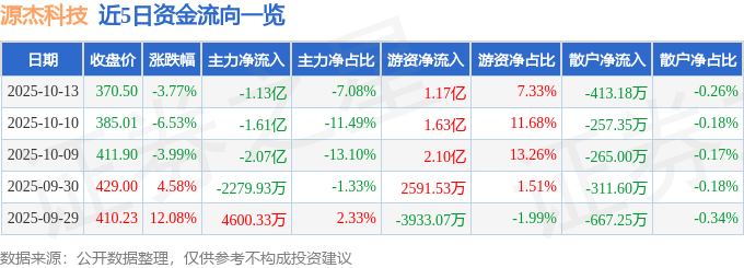 证券之星消息,截至2025年10月13日收盘,源杰科技(688498)报收于370.5元,下跌3.77%,换手率7.1%,成交量4.27万手,成交额15.99亿元。