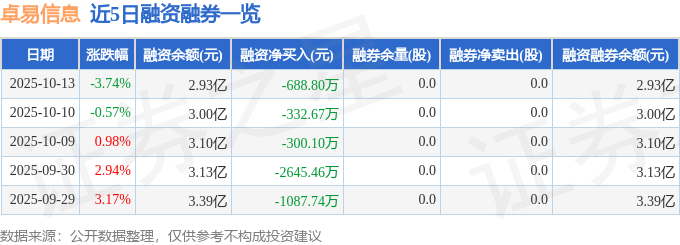 卓易信息融资融券信息显示,融资方面,当日融资买入6476.88万元,融资偿还7165.68万元,融资净偿还688.8万元。融券方面,融券卖出0.0股,融券偿还0.0股,融券余量0.0股,融券余额0.0万元。融资融券余额2.93亿元。