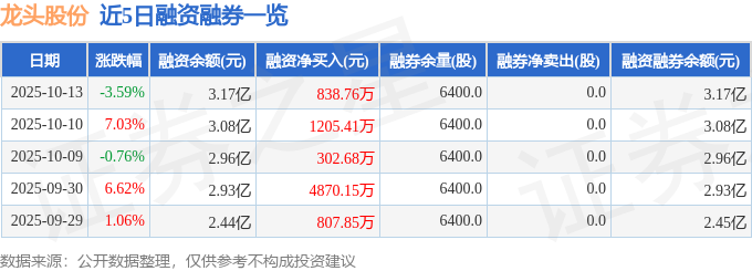 证券之星消息,截至2025年10月13日收盘,龙头股份(600630)报收于9.4元,下跌3.59%,换手率7.98%,成交量33.9万手,成交额3.17亿元。