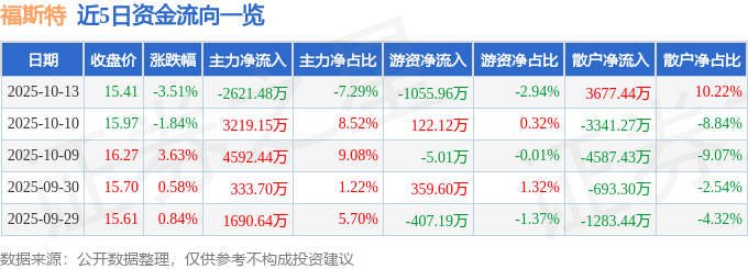 证券之星消息,截至2025年10月13日收盘,福斯特(603806)报收于15.41元,下跌3.51%,换手率0.9%,成交量23.42万手,成交额3.6亿元。