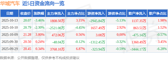 证券之星消息,截至2025年10月13日收盘,华域汽车(600741)报收于20.07元,下跌3.46%,换手率0.9%,成交量28.47万手,成交额5.74亿元。