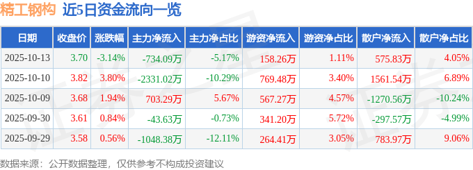 证券之星消息,截至2025年10月13日收盘,精工钢构(600496)报收于3.7元,下跌3.14%,换手率1.93%,成交量38.45万手,成交额1.42亿元。