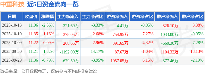 证券之星消息,截至2025年10月13日收盘,中重科技(603135)报收于11.06元,下跌2.56%,换手率3.51%,成交量8.87万手,成交额9655.15万元。