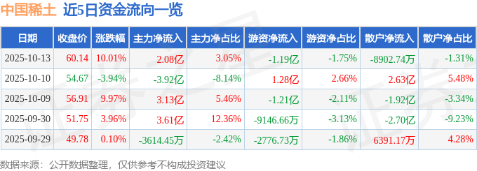 证券之星消息,截至2025年10月13日收盘,中国稀土(000831)报收于60.14元,上涨10.01%,换手率11.02%,成交量116.92万手,成交额68.13亿元。