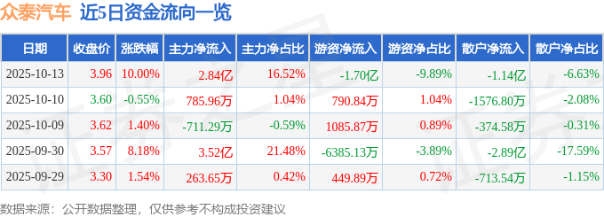 证券之星消息,截至2025年10月13日收盘,众泰汽车(000980)报收于3.96元,上涨10.0%,换手率8.87%,成交量446.21万手,成交额17.17亿元。