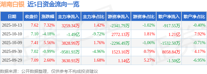 证券之星消息,截至2025年10月13日收盘,湖南白银(002716)报收于7.62元,上涨7.32%,换手率14.23%,成交量312.15万手,成交额22.89亿元。