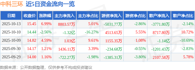 证券之星消息,截至2025年10月13日收盘,中科三环(000970)报收于15.45元,上涨6.99%,换手率9.59%,成交量116.61万手,成交额17.59亿元。