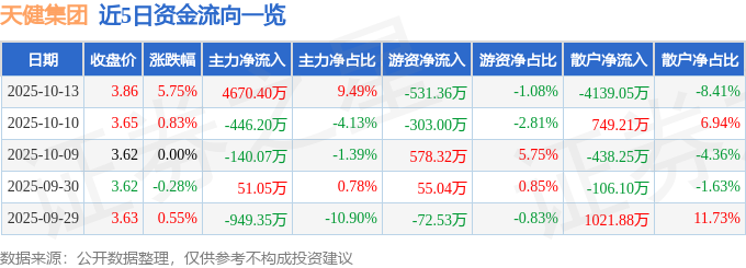证券之星消息,截至2025年10月13日收盘,天健集团(000090)报收于3.86元,上涨5.75%,换手率6.9%,成交量129.01万手,成交额4.92亿元。