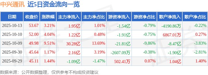 证券之星消息,截至2025年10月13日收盘,中兴通讯(000063)报收于53.67元,上涨3.21%,换手率9.14%,成交量368.25万手,成交额193.18亿元。