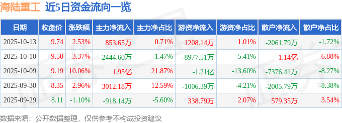证券之星消息,截至2025年10月13日收盘,海陆重工(002255)报收于9.74元,上涨2.53%,换手率19.59%,成交量125.01万手,成交额12.01亿元。