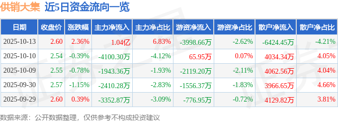 证券之星消息,截至2025年10月13日收盘,供销大集(000564)报收于2.6元,上涨2.36%,换手率4.04%,成交量594.23万手,成交额15.27亿元。