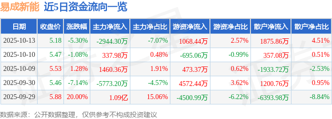证券之星消息,截至2025年10月13日收盘,易成新能(300080)报收于5.18元,下跌5.3%,换手率4.33%,成交量81.03万手,成交额4.16亿元。