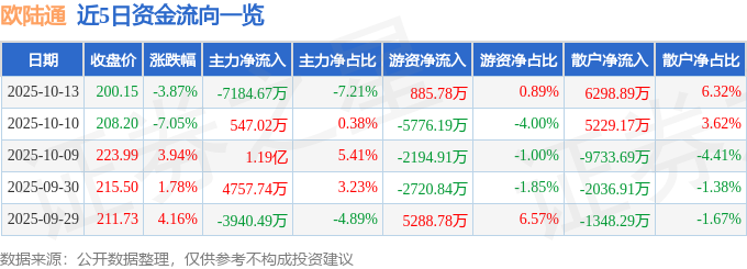 证券之星消息,截至2025年10月13日收盘,欧陆通(300870)报收于200.15元,下跌3.87%,换手率4.55%,成交量5.0万手,成交额9.96亿元。
