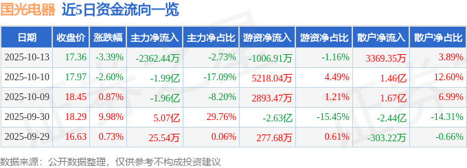证券之星消息,截至2025年10月13日收盘,国光电器(002045)报收于17.36元,下跌3.39%,换手率9.0%,成交量50.56万手,成交额8.65亿元。