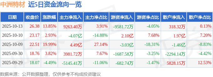 证券之星消息,截至2025年10月13日收盘,中洲特材(300963)报收于26.38元,上涨13.85%,换手率33.23%,成交量96.16万手,成交额23.67亿元。