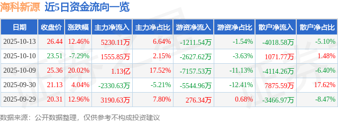 证券之星消息,截至2025年10月13日收盘,海科新源(301292)报收于26.44元,上涨12.46%,换手率37.35%,成交量31.78万手,成交额7.88亿元。