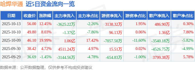 证券之星消息,截至2025年10月13日收盘,哈焊华通(301137)报收于56.0元,上涨12.45%,换手率17.26%,成交量31.1万手,成交额16.06亿元。