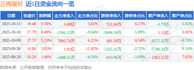 证券之星消息,截至2025年10月13日收盘,正海磁材(300224)报收于19.48元,上涨9.5%,换手率17.04%,成交量157.68万手,成交额29.74亿元。