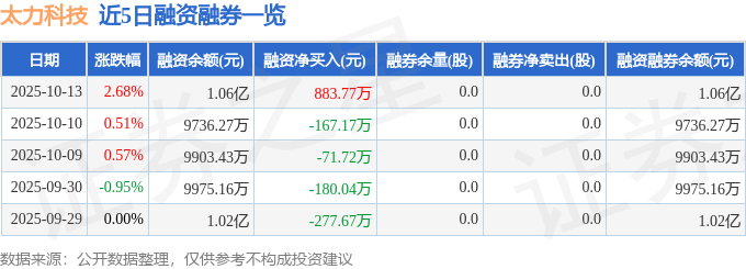 太力科技融资融券信息显示,融资方面,当日融资买入1555.57万元,融资偿还671.8万元,融资净买入883.77万元。融券方面,融券卖出0.0股,融券偿还0.0股,融券余量0.0股,融券余额0.0万元。融资融券余额1.06亿元。