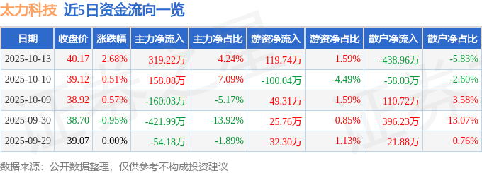 证券之星消息,截至2025年10月13日收盘,太力科技(301595)报收于40.17元,上涨2.68%,换手率8.2%,成交量1.89万手,成交额7533.11万元。
