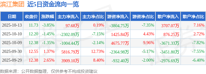 证券之星消息,截至2025年10月13日收盘,滨江集团(002244)报收于11.73元,下跌3.85%,换手率1.64%,成交量43.93万手,成交额5.18亿元。