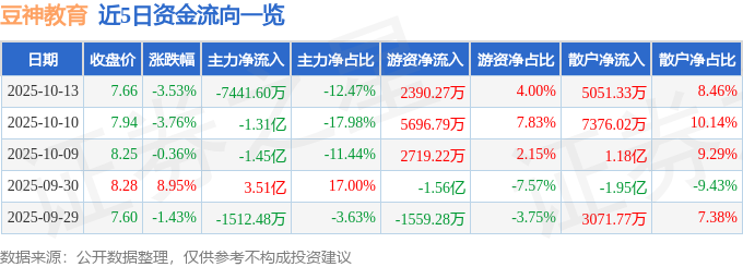证券之星消息,截至2025年10月13日收盘,豆神教育(300010)报收于7.66元,下跌3.53%,换手率4.7%,成交量78.25万手,成交额5.97亿元。