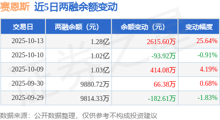 证券之星消息,10月13日,赛恩斯(688480)融资买入5335.04万元,融资偿还2719.43万元,融资净买入2615.6万元,融资余额1.28亿元。