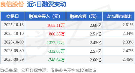证券之星消息,10月13日,良信股份(002706)融资买入5013.58万元,融资偿还3331.47万元,融资净买入1682.11万元,融资余额2.68亿元。