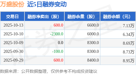 证券之星消息,10月13日,万盛股份(603010)融资买入2712.2万元,融资偿还1748.23万元,融资净买入963.97万元,融资余额1.13亿元,近20个交易日中有11个交易日出现融资净买入。