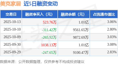 证券之星消息,10月13日,美克家居(600337)融资买入1208.28万元,融资偿还684.52万元,融资净买入523.76万元,融资余额1.01亿元。