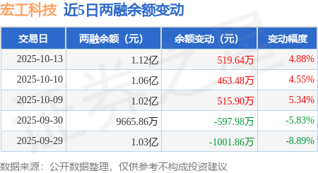 证券之星消息,10月13日,宏工科技(301662)融资买入2087.98万元,融资偿还1568.34万元,融资净买入519.64万元,融资余额1.12亿元,近3个交易日已连续净买入累计1499.02万元。
