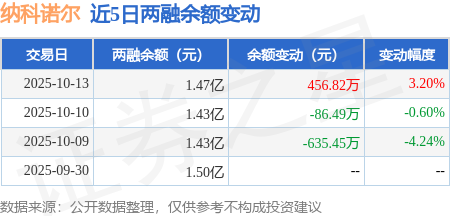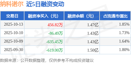 证券之星消息,10月13日,纳科诺尔(920522)融资买入1696.01万元,融资偿还1239.19万元,融资净买入456.82万元,融资余额1.47亿元。