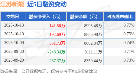 证券之星消息,10月13日,江苏新能(603693)融资买入763.2万元,融资偿还621.7万元,融资净买入141.5万元,融资余额8995.48万元,近3个交易日已连续净买入累计885.92万元。