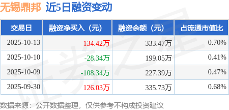 证券之星消息,10月13日,无锡鼎邦(920931)融资买入148.47万元,融资偿还14.05万元,融资净买入134.42万元,融资余额333.47万元。