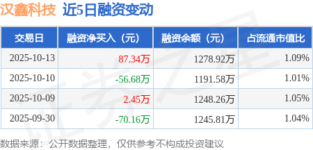 证券之星消息,10月13日,汉鑫科技(920092)融资买入220.08万元,融资偿还132.74万元,融资净买入87.34万元,融资余额1278.92万元。
