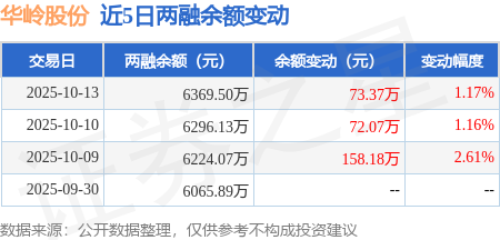 证券之星消息,10月13日,华岭股份(920139)融资买入285.83万元,融资偿还212.46万元,融资净买入73.37万元,融资余额6369.5万元,近3个交易日已连续净买入累计303.61万元。