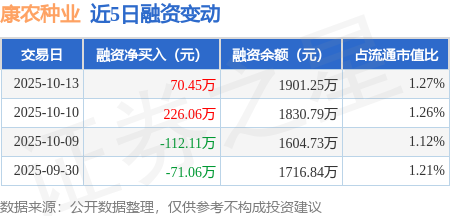 证券之星消息,10月13日,康农种业(920403)融资买入776.92万元,融资偿还706.47万元,融资净买入70.45万元,融资余额1901.25万元。