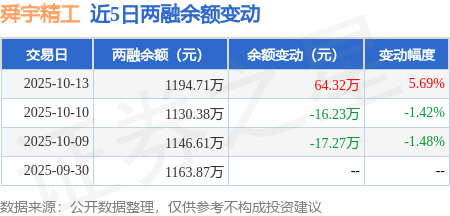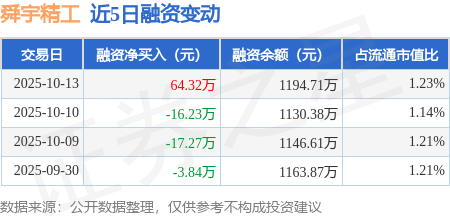 证券之星消息,10月13日,舜宇精工(920906)融资买入184.38万元,融资偿还120.06万元,融资净买入64.32万元,融资余额1194.71万元。