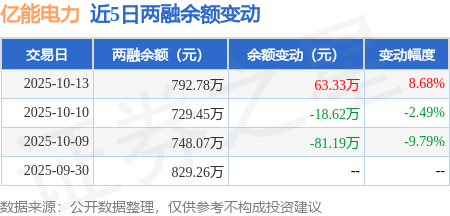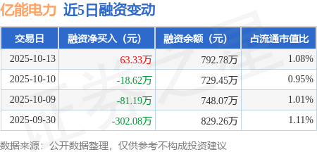 证券之星消息,10月13日,亿能电力(920046)融资买入166.36万元,融资偿还103.02万元,融资净买入63.33万元,融资余额792.78万元。
