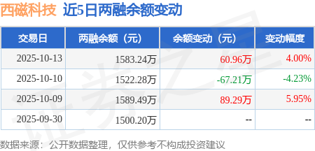 证券之星消息,10月13日,西磁科技(920061)融资买入838.61万元,融资偿还777.65万元,融资净买入60.96万元,融资余额1583.24万元。