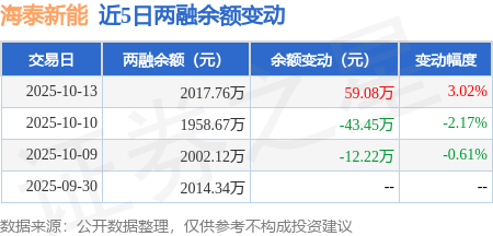 证券之星消息,10月13日,海泰新能(920985)融资买入102.04万元,融资偿还42.96万元,融资净买入59.08万元,融资余额2017.76万元。