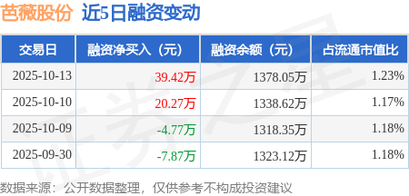 证券之星消息,10月13日,芭薇股份(920123)融资买入80.64万元,融资偿还41.22万元,融资净买入39.42万元,融资余额1378.05万元。